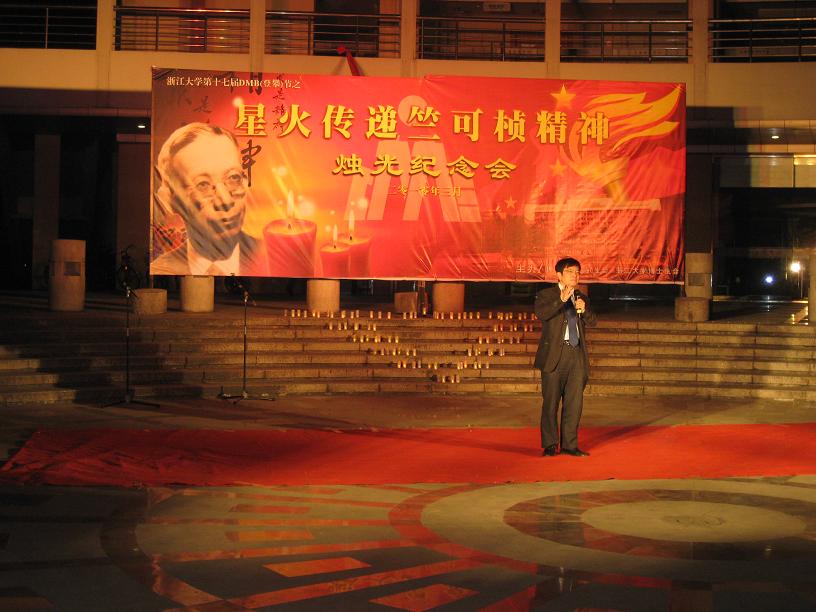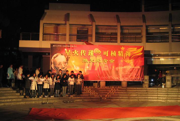 3297点,为深切缅怀竺可桢校长,材料科学与工程0703团支部成员参加了由浙江大学研究生会、博士生会共同举办的纪念竺可桢校长诞辰120周年之星火传递竺可桢精神烛光纪念会。烛光纪念会在玉泉校区永谦广场举行。校党委副书记郑强,校史研究专家杨达寿,党委研工部部长吕淼华,副部长王苑、李文腾以及三百余名同学参加了此次纪念活动。