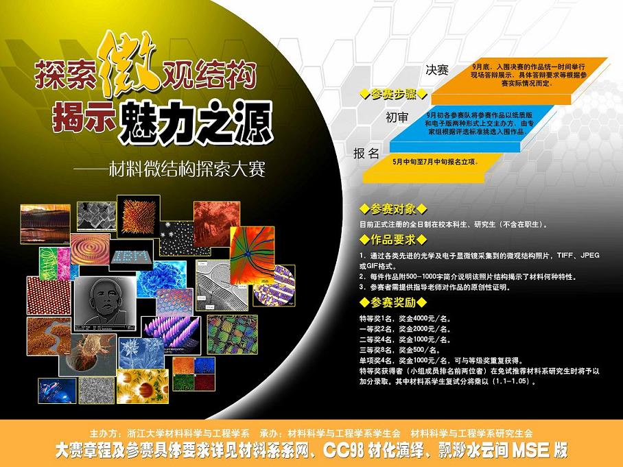 一、参赛对象: 日前正式注册的全日制在校本科生、研究生(不含在职生)。 二、参赛方式 参赛作品可以分为个人作品和集体作品,申报个人作品的,申报人必须承担申报作品60%以上的研究工作,合作者必须是学生且不得超过两人;集体作品必须均是学生,总人数不超过四人。 三、参赛步骤 1、前期宣传报名阶段:5月份开始竞赛委员会负责通过组织各类讲座和建立专门网站、制作喷绘、海报等各种形式宣传此次大赛,扩大知名度,参赛同学下载报名表,于7月中旬报名立项。 2、初审文本审核阶段:9月初各队将参赛作品以文本版和电子版两种形式上交主办方,由专家组根据评选标准挑选入围作品。 3、决赛现场答辩阶段:9月底,入围决赛的作品统一时间举行现场答辩展示,具体答辩要求等根据参赛实际情况而定。 4、获奖作品宣传阶段:特等奖及一二等奖获奖作品将以POSTER形式展出,同时在大赛网站上宣传(网站地址:http:/microstructure/)。 四、参赛注意事项 1、参赛作品必须是距竞赛申报日前两年内完成的学生作品。 2、以个人或者集体为单位申报的作品数量不超过三件,9月份文本初审阶段经过专家组的审核后至多保留一件作品,除非有非常优秀的作品,经专家审核可保留两件 3、申报作品要求:(a)微观结构照片;(b)说明该照片结构揭示了材料何种特性的文字稿或图示稿;(c)指导老师对作品的原创性证明 4、作品规格:摄影作品不限彩色或者黑白,但均以数位档案交件( 5、参赛作品限于用以下几种常规设备: A、传统光学显微镜组;B、电子显微镜组;C、扫描式探针、荧光显微镜组 6、参赛作品允许局部调明暗以及调整偏色、调整锐化要呈现自然的效果,但不能进行合成、修除、翻拍、无中生有或者有中生无。若有修改合成之争议,将以专家组审查意见为评判依据。参赛者有举证之义务,并对判定之意见不得异议。 7、作品评选标准: a、学术性(作品理念、创意、学术含义) 40% b、专业性(取像、曝光、聚焦、景深、象散等光学技巧) 30% c、艺术性(意境表达、想象力) 30% 8、参赛者在大赛网站下载报名表,认真填写各成员信息之后由导师签字确认,参赛队员须签署承诺书(在报名表中)。 9、报名表发送至邮箱:microstructure_mse@163.com;报名截止时间: 五、奖励 l 特等奖1名,奖金4000元/名。 l 一等奖2名,奖金2000元/名。 l 二等奖4名,奖金1000元/名。 l 三等奖8名,奖金500/名。 l 单项奖4名,奖金1000元/名,可与等级奖重复获得。 三等奖以上获得者(小组成员排名前两位者)在免试推荐材料系研究生时将予以加分录取。其中材料系学生复试分将乘以(1.1-1.05)。