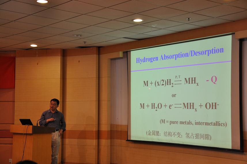 随后,复旦大学材料科学系孙大林教授用生动的幻灯片和幽默的语言向我们作了题为“Hydrogen in Solid-state Materials”的报告。 孙大林教授长期从事储氢材料的基础和应用研究,尤其在络合氢化物储氢材料方面开展了出色的研究工作。孙大林教授的报告从氢能的社会意义出发,介绍了氢能技术的特点和发展过程,浏览了当前氢能技术研究开发的前沿,展望了氢能技术应用前景,着重讲述了制约氢能推广使用的瓶颈—储氢技术和络合氢化物储氢材料方面相关研究成果。报告会后,孙大林教授回答了有关提问,和与会的老师、同学一起探讨了实际研究中的细节和难题。