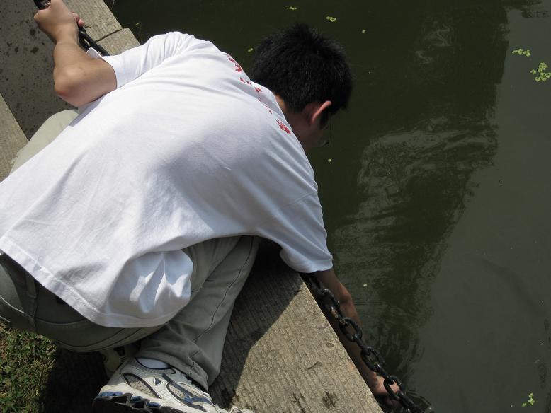 经过一段时间的休整,下午队员们沿环城路先后途经绍兴环城河南端和东段。这是队员们赴绍兴后第一次实地考察,高温酷暑和长途步行让队员们出现了不同程度的疲劳感,但队员们通过相互鼓励,顺利完成了考察任务。在行走过程中,队员们一边仔细观察环城河水质情况,在有代表性的地方提取水样,一边积极地与环城河护卫工人交流。从他们口中,队员们得到了关于环城河建设和维护及水质变化的第一手资料。队员们还主动向环卫工人赠送矿泉水,为环卫工人在炎炎夏日带来一丝清凉。