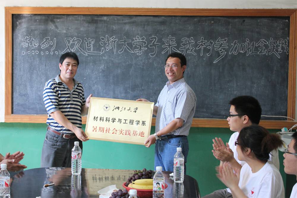 在大家热情而真挚的座谈后,队员们进行了首项重点活动——浙江大学材料系社会实践基地的授牌仪式。王东老师代表本次社会实践团将包含浙大学子真诚愿望的铜牌交到村支书刘国忠的手中。对浙大学生而言,建立这么一个实践基地的意义无疑是重大的,学生的本职工作当然是学习,但是千万不要忘记学生是终将要走进社会,回报社会,服务社会的。特别是对于研究生而言,身份已不单纯是学生,能够有机会走出校门深入了解社会对他们的帮助不言而喻。