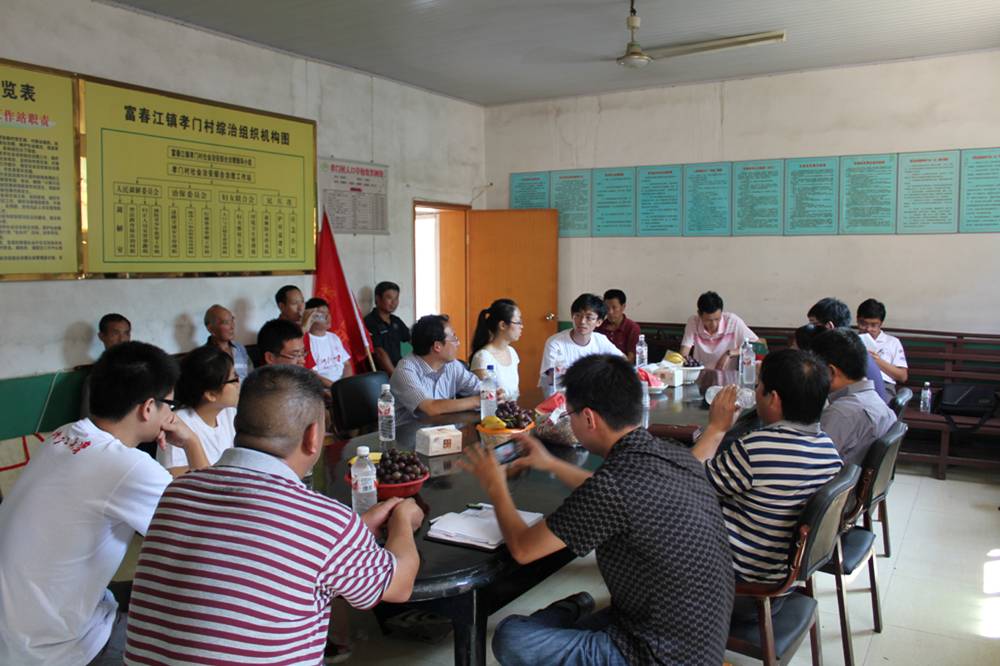 上午9点,实践团在材料系党委书记王东老师和团委副书记徐晗老师的带领下早早地到达孝门村村委办公室。俗话说,工欲善其事必先利其器,为了了解情况以便顺利开展活动,团队先和当地领导和群众进行了座谈活动。本次暑期实践活动引起了地方的高度重视并吸引了当地媒体的报道,富春江镇党委书记季建平、桐庐县团委副书记徐雯、县团委办公室主任唐志立、镇团委书记李斌、孝门村支部书记刘国忠、村委主任孙忠伟等出席了本次座谈。座谈会中,团队负责人吴�向与会各位介绍了本次暑期实践的初衷、目标以及活动安排。王东老师就几年前温家宝总理给浙大学子的回信中谈到的农村问题切入,对当代大学生教育问题娓娓而谈,强调了浙江大学对于学生暑期社会实践的支持。季书记等领导首先表示了对同学们的欢迎,然后真诚地对一些农村普遍存在的问题与队员们进行了讨论,甚至无不担忧的提出了“空心村”这个概念,对浙大学子能够深入农村基层进行实践活动表示了赞许,期待这个活动能够一直举办下去。村支书刘国忠详细地为大家介绍了孝门村的情况,孝门村是颇为典型的浙江农村——私营企业遍布。当然孝门村也有自己的特点——结合当地的秀美风光和人文名迹发展旅游业。所以尽管没有位处交通枢纽地带,却硬是凭着本地人的辛勤开拓,把孝门村发展成为富庶发达的经济新村。