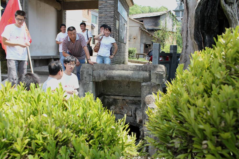 图三 团队负责人给王东老师介绍孝泉井的来历,井边为孝泉亭和几百年的古柏树