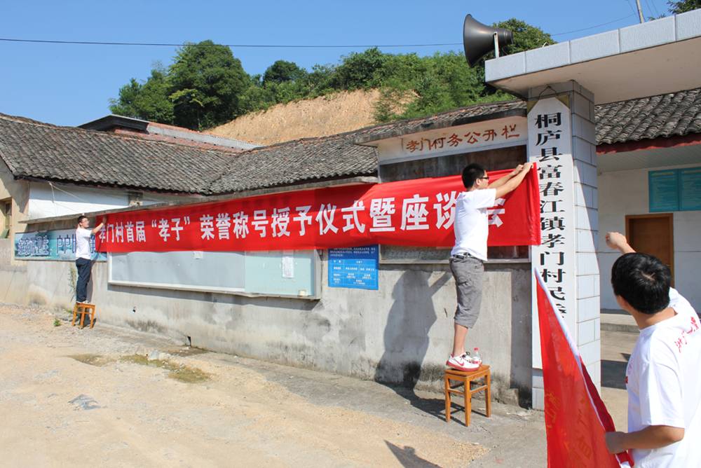 本次实践的第一项活动主题即宣传“孝道”——协助孝门村进行“孝子”评选。通过村民介绍了解到这些“孝子”的孝行后,队员们无不为之感动。他们中有年逾花甲的老伯,几十年如一日的侍奉母亲,即使不是他亲生母亲,他也照顾有加,甚至严禁自己的媳妇对老人大小声;也有普通中年农民,虽然家庭条件一般,也有个条件较好的亲哥哥,他也毫无怨言地主动承担起照顾老人的责任,对老人关怀备至;还有事业有成的企业家,在替双亲养老送终后坚持每年过年过节给村里的老人送水果和日常用品。在了解了孝子们的事迹之后,县团委及镇党委的领导们为孝子们颁发了荣誉证书和奖品,对他们的事迹表示赞许并鼓励他们不仅要继续行孝还要鼓励周围的人一起拿出行动,把孝门村的孝文化继续发扬光大。