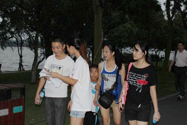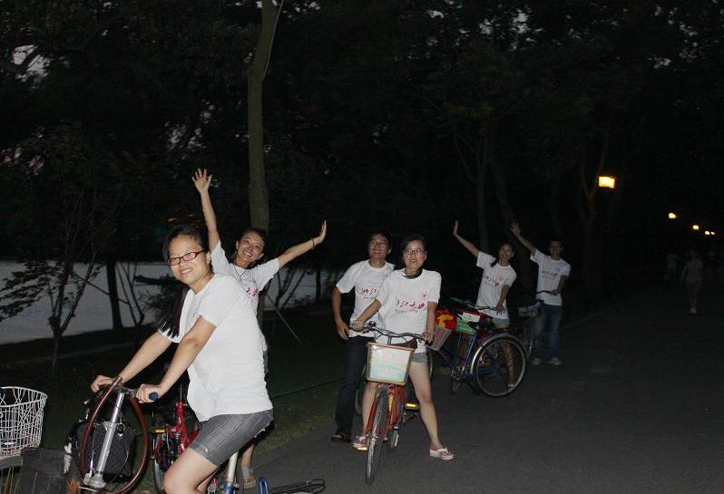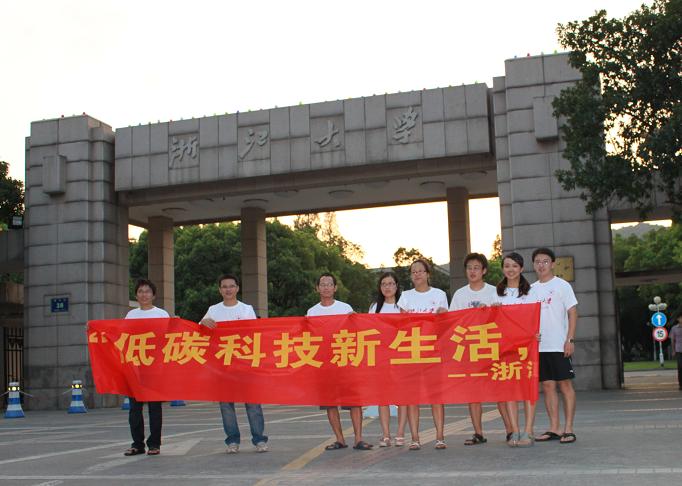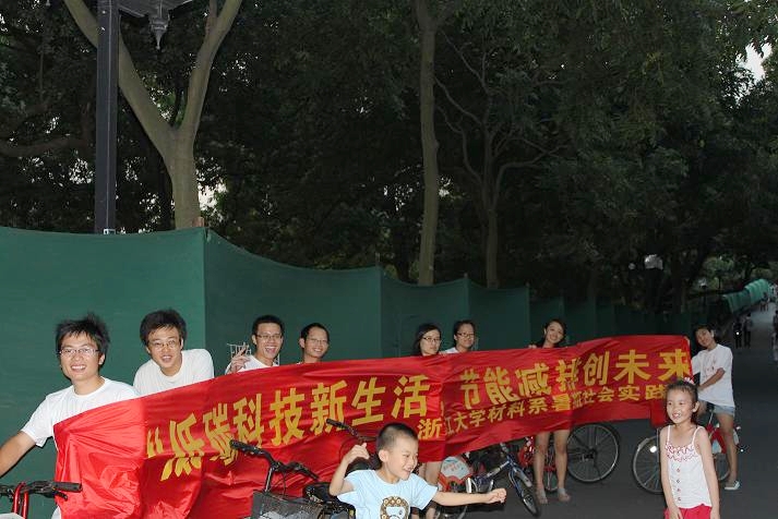 活动伊始,实践团成员们便在浙江大学门前集结,共同喊起了 “低碳、节能”的口号。随后,实践团成员全部骑脚踏车,从正门出发,沿苏堤—杨公堤的路线出行,开始了宣传活动。