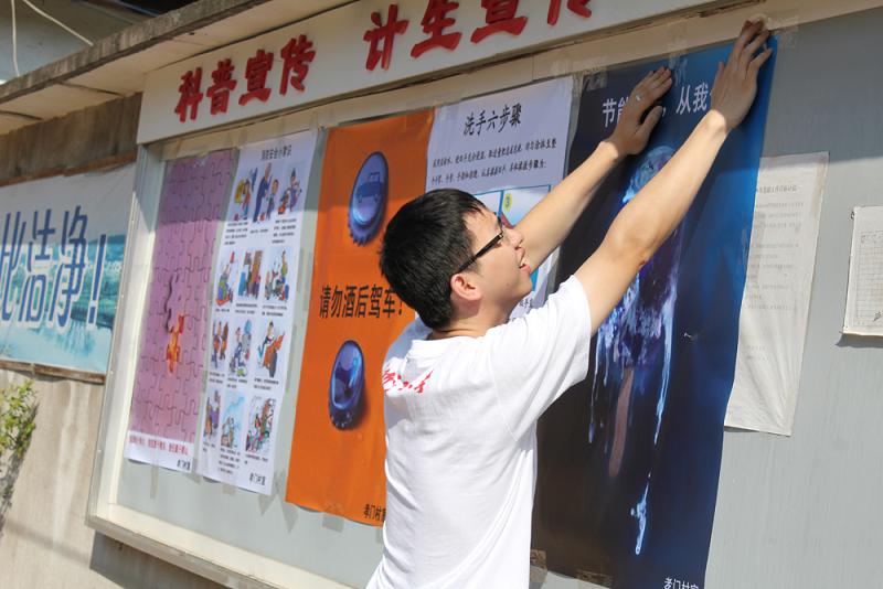 尽管还是上午,但早已烈日当头,队员们在村里几个显眼的宣传栏里张贴低碳环保主题海报,以前村子里宣传低碳主题力度不够甚至几乎没有。宣传海报贴出后,村民就围观上来,队员们也悉心地给村民们讲解低碳理念:从能源危机到环境隐患,从生产交通工具到日常家用电器,队员们生动形象地解释给村民节约能源,低碳环保要靠日常的点滴节约,点滴积累。张贴完海报后,队员们不顾天气的炎热,马不停蹄地走入家家户户,给村民们送上环保袋,并且送上利用学校实验室一些单面打印过的废弃纸张打印的低碳主题宣传单。