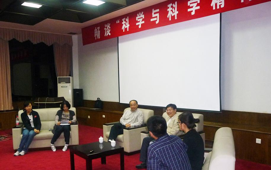 此次讲座以互动座谈会的形式进行,主持人高倩邀请老师和同学们来到台上,与张泽院士近距离对话,感受大师风范,现场气氛轻松愉悦。首先主持人用三个词对张泽院士进行了描述——年轻、专业和亲切。这一精炼的概括拉近了张院士与学生的距离。对现场观众的提问,张泽院士进行了深入浅出、生动翔实的解答,向大家阐释了科学与科学精神这一主题的内涵。