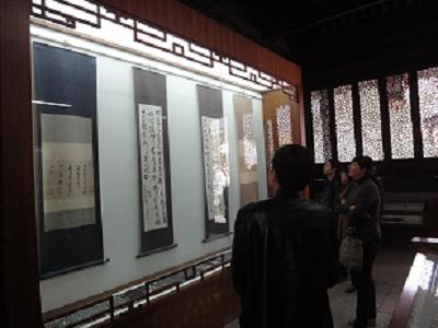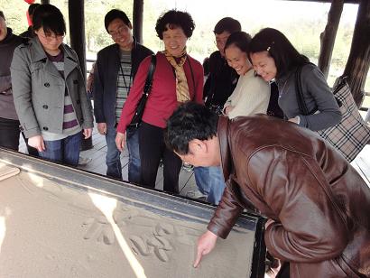 午饭后,一部分教职工意犹未尽,要求再去兰亭一游。兰亭是著名的书法圣地,春秋时越王勾践种兰于此,东汉时建有驿亭,兰亭由此得名。东晋永和九年,大书法家王羲之邀请了41位文人雅士在兰亭举行了曲水流觞的盛会,并写下了被誉为“天下第一行书”的《兰亭集序》,王羲之被尊为书圣,兰亭也因此成为书法圣地。 “此地有崇山峻岭,茂林修竹,又有清流急湍,映带左右,引以为流觞曲水”。王羲之《兰亭集序》所描绘的景象映入眼帘,来到“曲水流觞”景点,张院士信步走到曲水边上,将一片树叶轻轻放入溪中,清澈的溪水载着树叶缓缓流动,不时打个漩儿。张院士饶有兴致地说:“当年王羲之和友人兰亭雅集,把酒杯里倒上酒让它从曲水上游缓缓漂下来,如果漂到谁面前停住了,谁就要饮酒作诗,作不出的则要罚酒,传为千古佳话。《兰亭集序》就是为这次诗集做的序。”大家又参观了《兰亭集序》的各种名家摹版,在沙盘前,喜欢书法的老师们还一展身手,何海平老师书写的“鹅”笔锋灵动,“畅叙幽情”意蕴无穷。