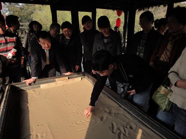 午饭后,一部分教职工意犹未尽,要求再去兰亭一游。兰亭是著名的书法圣地,春秋时越王勾践种兰于此,东汉时建有驿亭,兰亭由此得名。东晋永和九年,大书法家王羲之邀请了41位文人雅士在兰亭举行了曲水流觞的盛会,并写下了被誉为“天下第一行书”的《兰亭集序》,王羲之被尊为书圣,兰亭也因此成为书法圣地。 “此地有崇山峻岭,茂林修竹,又有清流急湍,映带左右,引以为流觞曲水”。王羲之《兰亭集序》所描绘的景象映入眼帘,来到“曲水流觞”景点,张院士信步走到曲水边上,将一片树叶轻轻放入溪中,清澈的溪水载着树叶缓缓流动,不时打个漩儿。张院士饶有兴致地说:“当年王羲之和友人兰亭雅集,把酒杯里倒上酒让它从曲水上游缓缓漂下来,如果漂到谁面前停住了,谁就要饮酒作诗,作不出的则要罚酒,传为千古佳话。《兰亭集序》就是为这次诗集做的序。”大家又参观了《兰亭集序》的各种名家摹版,在沙盘前,喜欢书法的老师们还一展身手,何海平老师书写的“鹅”笔锋灵动,“畅叙幽情”意蕴无穷。