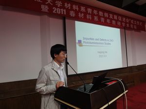 半导体材料所的年轻副研究员余学功博士最先就其在硅太阳能电池方面的研究做了汇报。硅太阳能电池一直是研究的热点,而材料系半导体材料所在单晶硅方面的研究一直居世界前列,研制出的硅太阳能电池的转化效率已达20%。汇报结束后,在座的多位教授提问,与余老师就单晶硅太阳能电池的应用前景进行了热烈的讨论。做完报告后余学功老师请假匆匆赶去医院,而当整个论坛接近尾声时,我们接到他的短信,得知他妻子刚刚生产,喜获女儿,为材料系青年教师发展促进会带来了第一个喜讯。