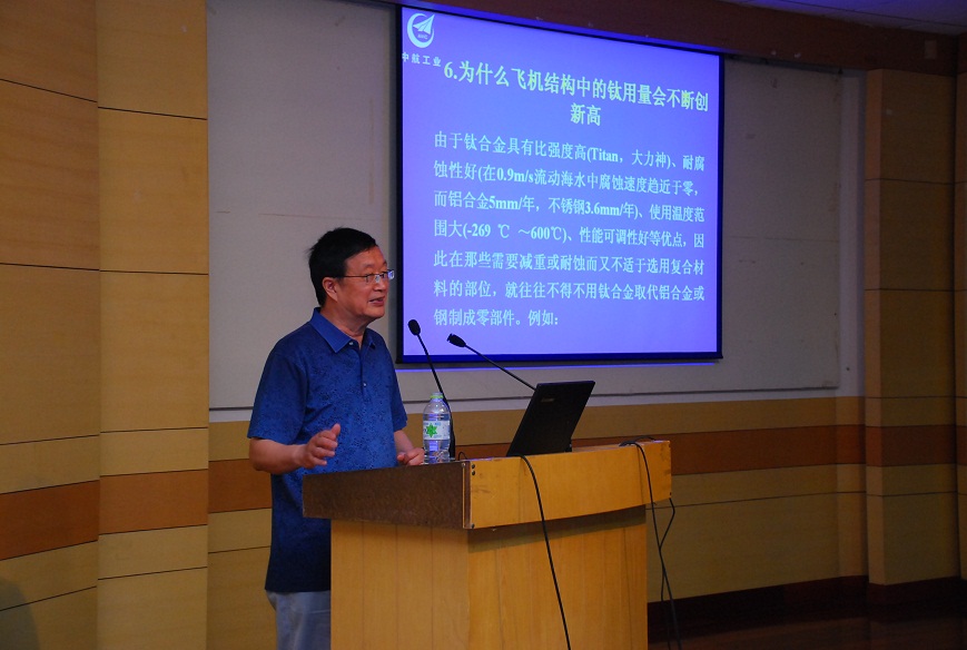接下来在热烈的掌声中,曹春晓院士为大家带来题为“一代材料,一代飞机”的讲座。曹院士从飞机机身材料的发展历程讲起,讲到国内外不同飞机机身选用材料的演变过程。他主要介绍了铝合金、钛合金、复合材料这三种机身材料在飞机中的应用以及比例变化,又分别以国内外具体机型为例介绍了不同材料对机身的影响。最后展望了机身材料的发展趋势,以及我国大飞机发展前景。