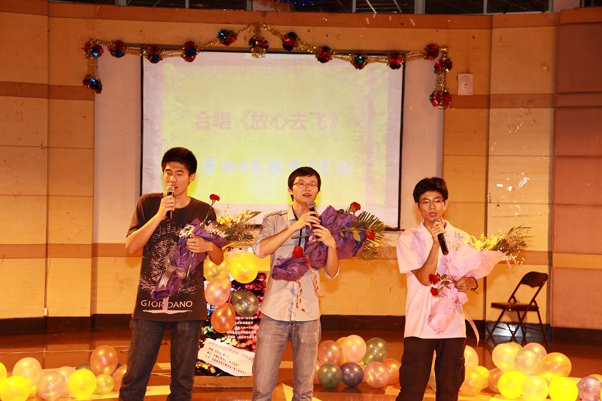 在晚会接近尾声的时候,会场大屏幕上出现了一幕离别的画面,材料系近100位同学一一在视频中登场,有寄语,有希望,有欢笑,更有感伤。我们是一个集体,一同走过了四年的时光,尽管其间也有离别,也有新朋友的加入,但是四年的情情谊,并不会因此而消减,反而在时间的沉淀中愈发浓烈。看着大屏幕上映出的大一、大二时自己略显稚嫩的表情,不禁引来同学们阵阵的喟叹和丝丝的感伤。耳边响起《放心去飞》的歌声,离别的思念浓浓的已经再也无法化开了。