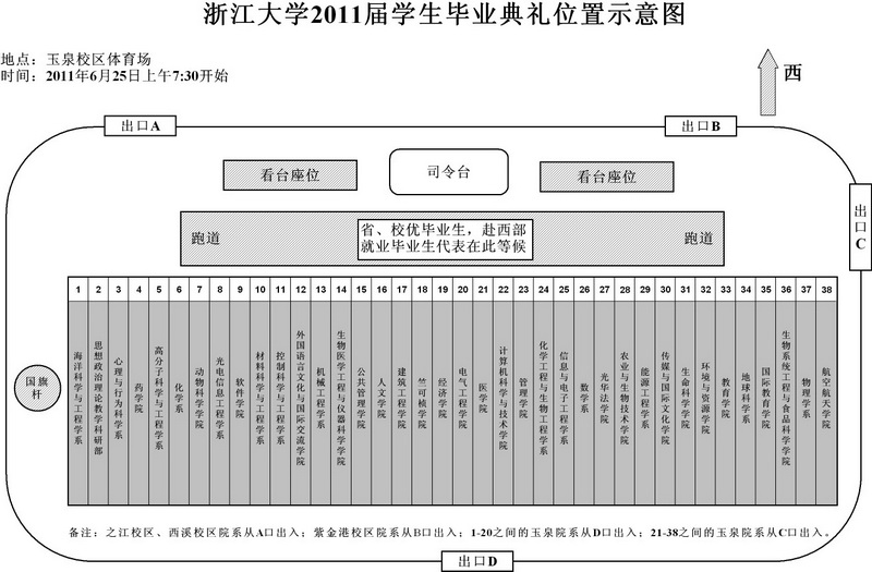 2011届学生毕业典礼将于2011年6月25日上午7:30在玉泉校区体育场举行,要求务必7:15以前进场完毕,不穿学位服。材料系位置见示意图,其中家属在后面。塑料袋由系里现场统一发放,系里代领代发。系旗系里准备。