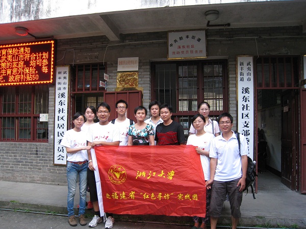 2011年7月30日,浙江大学赴福建省“红色寻访”社会实践团来到了武夷山市新丰街道溪东社区,探访社区老同志,了解社区服务建设,切身体会和谐社会,并身体力行地实践党对老同志们的无限关怀。社区居委会主任兼党支部书记吴伯惠同志亲切的接待了我们,并向我们耐心地介绍社区概况,近年来发展情况,并向我们介绍了一些社区的老同志,与这些老同志进行亲切的交流。