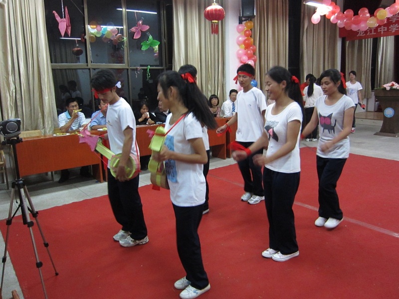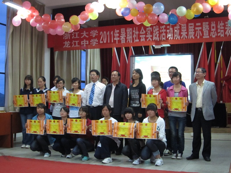 晚上7点半,“浙江大学——龙江中学2011年暑期社会实践活动成果展示与总结表彰暨文艺晚会”准时在龙江中学大礼堂举行。晚会开始,浙江大学材料系支教队队长陈晓龙致词,他代表全体支教队员表达了对龙江中学校领导,各位老师及全体同学这十天来对这次支教工作的大力支持的感激之情,表达了将支教西部这项志愿工作坚持下去的决心,为国家西部教育建设贡献出自己的力量的坚定信念。龙江中学副校长致词,表达了对浙江大学支教团队全体成员的感谢,他表示,希望浙江大学大学生支教龙江中学这项活动能够坚持办下去,希望浙江大学能有更多力量来到西部,支援西部教育,提高西部教育水平。之后,校领导为浙江大学支教队全体队员颁发了荣誉证书,为这十天来学习成果优异的高三学生颁发了奖状作为进入高三的第一次鼓励。表彰结束后,节目表演正式开始。各小组的歌曲联唱,动感十足的街舞表演,具有民族风情的左脚舞表演,舞蹈特长生的新疆舞蹈表演,以及队员们献上的一首浙大校歌,整个晚会的节目都十分精彩。老师们也走上台来,和同学们一起做游戏,现场充满了欢声笑语。