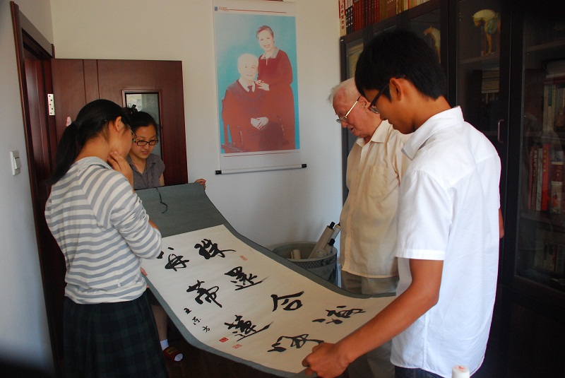 王老的家里悬挂着多幅书法作品,原来老人对书画诗词颇有研究,还曾经给学生讲书法、绘画和艺术鉴赏。谈起书道,王老笑笑:“心正笔自正,勤学方能精啊。”老人带我们走进他的书房“二知斋”,并自豪地展示了他的几幅作品。有纪念香港回归的,有纪念邓小平同志诞辰一百周年的……遒劲有力的笔触中饱含着老人的爱国热情、赤子情怀。