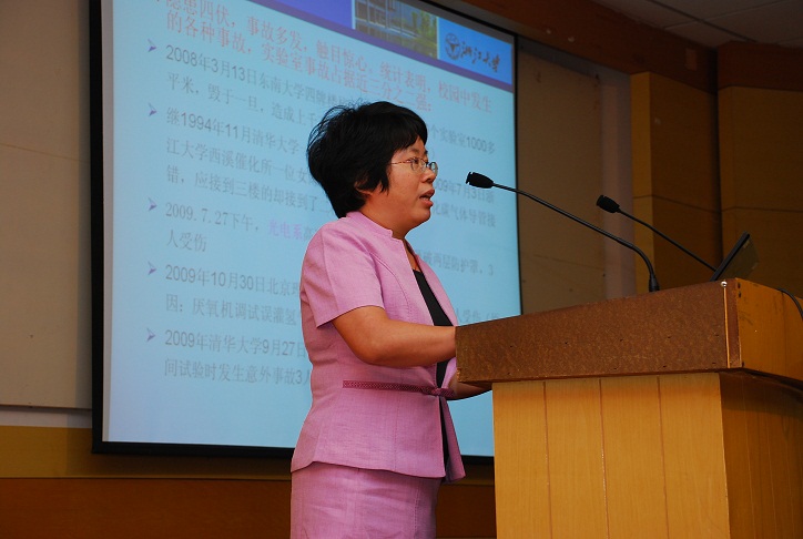 随后,她详细的向同学们介绍了材料系实验室特点、实验室安全基本状况、实验室安全工作管理、实验室电气安全、灭火与急救、保护自身生命财产等几个方面,提出了良好的实验室习惯是保障实验室安全的首要条件,她希望2011的研究生新生能充分了解到实验室安全的重要性,掌握并牢记实验室安全知识,只有这样才能在追求学业进步的同时保护好自己,为创建和谐、平安校园作出各自的贡献。