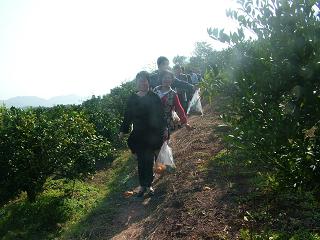 游览千岛湖后,大家游性高涨,驱车来到当地的桔园,沿着坎坷的小道,拿着剪刀和袋子,流连在浓密的桔园中,挑选着心仪的桔子。放眼四望,金灿灿的果实挂满枝头,自有一种回归自然的朴实与恬淡。吃着农家饭,品着农家菜,看着鳞次栉比的幢幢新楼,拎着沉甸甸的劳动成果,不由感慨现在中国农民日新月异、今非昔比的变化。