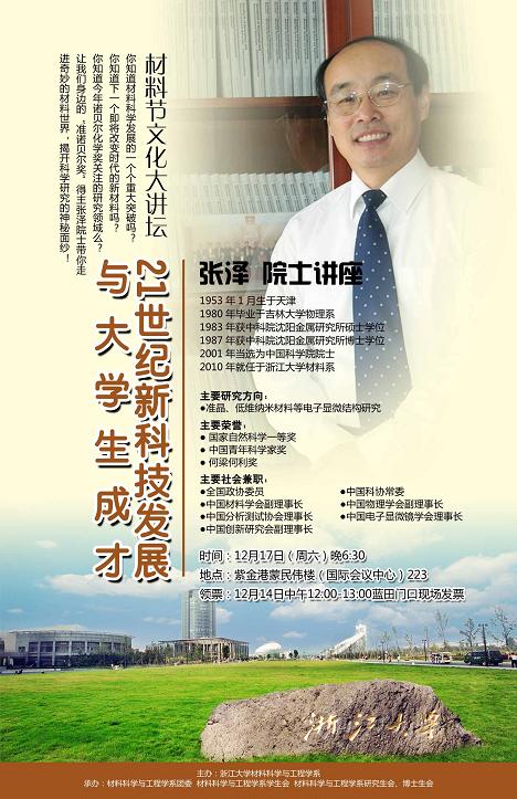 张泽院士讲座“21世纪新科技发展与大学生成才”欢迎参加!