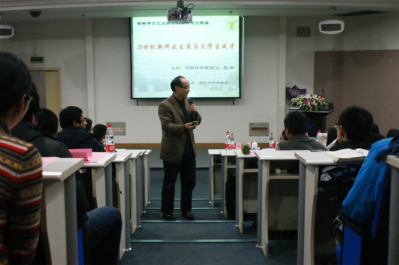 12月17日晚上六点半,中国科学院院士,著名材料科学家,张泽院士来到紫金港校区国会223与低年级本科大学生面对面,漫谈“21世纪新科技与大学生成才”。材料系系主任叶志镇教授、系党委书记王东老师、副系主任涂江平教授等出席,与同学们亲切交流,现场气氛十分高涨。