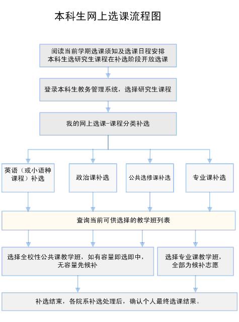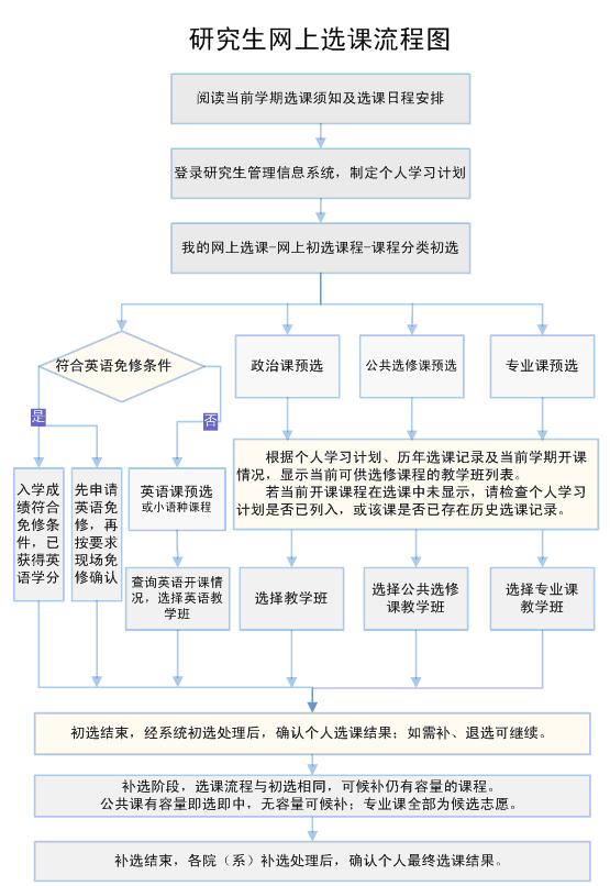 各位研究生: 选课前请仔细阅读网上选课须知。 各阶段选课结束后,请务必上网查询确认个人选课结果,如有问题请联系研究生培养处或相关开课学院(系)。 具备选课资格的本科生选研究生课程安排在补(退)选阶段。研究生选本科生课程安排在第三、四阶段,具体相关事宜请咨询本科生选课中心。 本次选课分初选、补(退)选、夏季退选等三个阶段,具体时间安排请见下表。