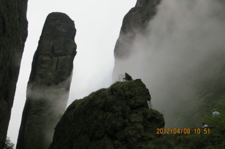 天下着蒙蒙细雨,为攀登山峰增加了难度,但云雾弥漫,烟岚迷乱,凝天、山于一色,融云、峰于一体,仿佛置身仙境。“安得此身生羽翼,与君来往醉烟霞”,无怪唐诗人白居易有此感叹。