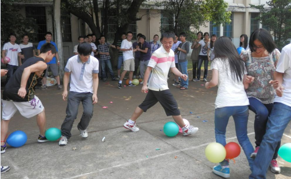 趣味运动会的项目分集体项目和个人项目两大部分,除沿袭了前几届趣味运动会中较受欢迎的项目,如“踩气球”、“双人背夹气球接力”外,又发展了“蒙眼投篮”、“滚雪球”等新式项目。首先进行的是集体项目,比赛以班级为单位进行,各个班经过简单的分组,推选出“代表选手”,迅速进入第一轮的“踩气球”PK。一时间,场上运动员踩破气球发出的噼啪声与场下同学的呐喊助威声交织成一片。