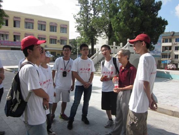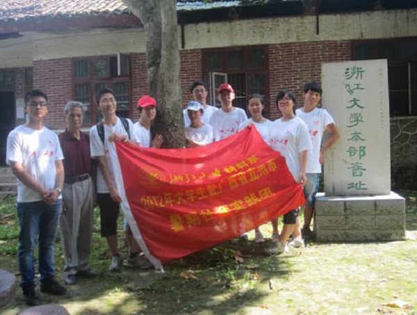 浙大于1938年迁至广西宜州,在那个战火纷飞、物资匮乏的年代,浙大师生辗转西迁,坚持办学。宜州是浙大西迁的第6站。浙大在此办学14个月,如今闻名全国的求是校训和校歌就是在此期间确立的,可以说宜州就是浙大的精神家园。莫瑞杨老人为实践团队员们详细地讲解了浙大西迁至宜州的办学情况和抗日义举。莫老虽年事已高,但讲到浙大的义举仍是情绪高昂,十分赞赏。他讲到当年浙大师生举行义卖为抗日前线筹款时,竺可桢校长把亡妻的怀表、绣帕等物捐出来拍卖时,对竺校长十分敬佩,不断赞扬浙大的师生的爱国情操。