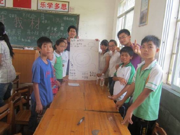 7月的广西,阳光明媚,队员们早早起了床,分头进行了教室的整理、游戏材料的准备、奖品的确定、课程内容的安排等等工作,为即将正式开始的支教活动做最后的准备。这里的孩子对上学有极高的热情,课前一小时就已有大半学生在教室里等待上课。8点半第一次课正式开始,在与孩子们相互认识后,实践团队员们将22个孩子分成3个小组,并协助他们产生各自的队名和口号。孩子们都十分活跃,积极参与队名和口号的设计,并将他们的想法画在展板上进行展示。一位队员在看了孩子们的成果后感慨道:“只要肯挖掘,每个孩子都是艺术家。旅途的奔波劳累都不重要,孩子们的纯真笑容就是最好的礼物。”