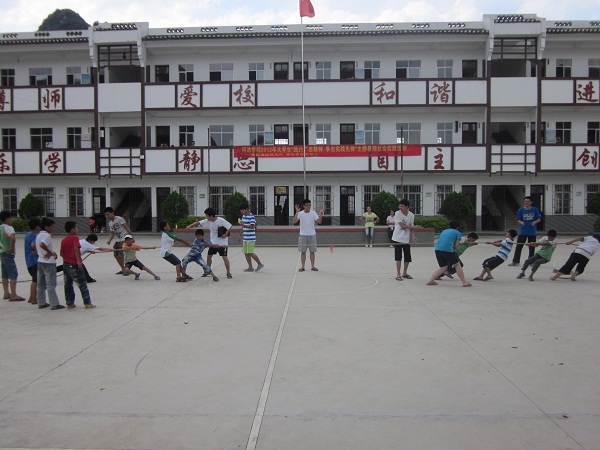 下午的户外活动课开展了多样活动,有男生们喜爱的篮球、乒乓球等球类活动和女生们擅长的跳绳、跳皮筋等,还有跳大绳、兔子舞、拔河等集体活动。首先进行的是跳大绳,这是孩子们最喜欢的课外活动之一,实践团成员们也乐在其中。明媚的阳光映在大家笑脸上,欢声笑语飘荡在整个村庄上空。之后的兔子舞、拔河等活动更是把气氛推向高潮。