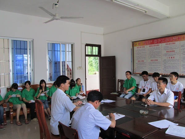 上午9点30分,座谈会在合寨村村委会办公室准时进行,首先,合寨村民委员会韦主任为大家重点介绍了中国第一个村民委员会——合寨村村民委员会的由来。由12个屯组成的合寨村在1980年成立了中国第一个村民委员会,合寨因而被称为“中国村民自治第一村”,韦主任重点介绍了“村委会”这个名字来源于当时街道的“街委会”。合寨村于当时由村民无记名投票选举产生了全国第一个村民自选的“村官”蒙光新。村委会选举为3年一届,现在已是第10届,村委会形成之初就吸纳了大量的党员,他们秉着一切源于群众,一切为了群众,从群众中来到群众中去的方针政策无报酬地为村民自治事业贡献自己的力量。合寨村人均年收入从原来的70多元快速增长到5100多元,如今的合寨村在中国共产党的领导下以养蚕业,甘蔗种植业为基础,以旅游业为突破口继续向前发展着,人民生活水平显著提高。韦主任报告结束后,大家进行了踊跃地提问。