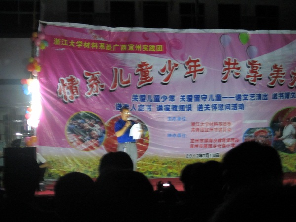 2012年7月18日晚,浙江大学材料系赴广西宜州社会实践团在合寨小学举行了一场联欢晚会,江苏卫视和中国党史发展录制组对本次晚会进行了现场录制。