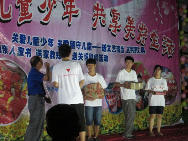 晚会的最后是一个捐赠仪式,由浙江大学材料系赴广西宜州社会实践团向合寨的留守儿童捐赠书籍和文具等用品,向合寨小学捐赠价值1600元的图书,并向校长赠送浙江大学的纪念品。