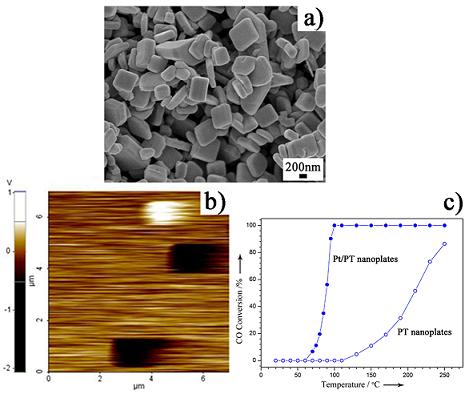 2012年9月10号,化学领域著名期刊德国应用化学(Angew. Chem. Int. Ed., 51, 9283, 2012)在线发表了题为 “Self-Templated Synthesis of Single-Crystal and Single-Domain Ferroelectric Nanoplates”的论文,该研究首次报道了水热法制备单晶、单畴的铁电PbTiO3纳米片(图2),揭示了其“自模板”的晶体生长机制,实现了纳米片铁电畴的读写,为超高密度信息存储提供了可能。同时,研究发现附载Pt颗粒的PbTiO3纳米片体系能够有效催化氧化一氧化碳,拓展了纳米铁电材料的应用,为探索铁电催化体系提供了新思路。钞春英同学为该论文第一作者,任召辉博士和韩高荣教授为通讯作者。