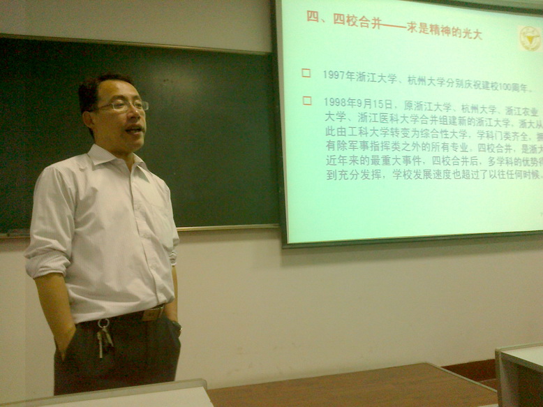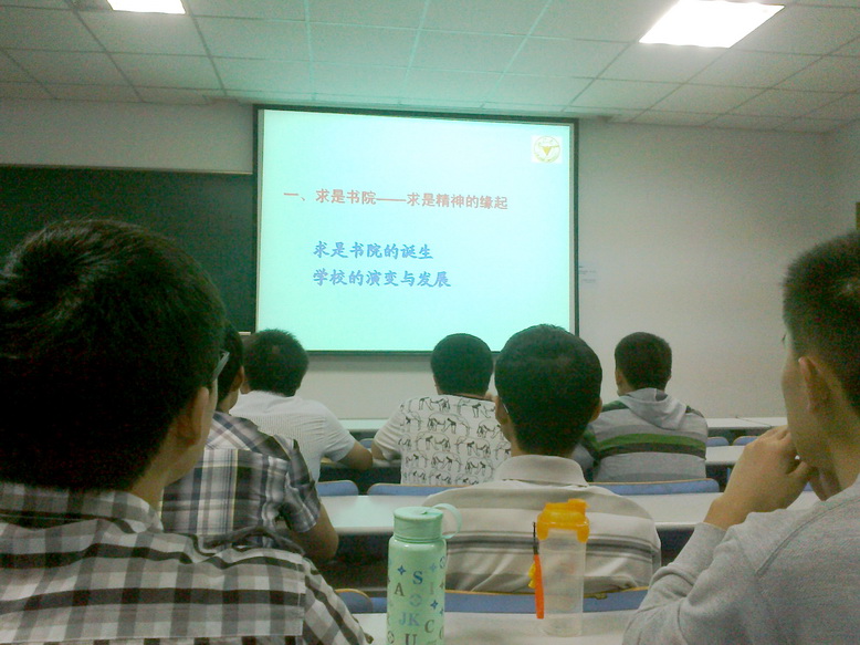 图一 王东老师作报告 浙江大学是一所具有百年历史底蕴的全国重点大学,了解浙大的发展史是每个浙大求是学子的必修课。王东老师主要向大家介绍了求是精神,求是书院,西迁简史,浙大校歌四部分内容,并重点阐述了求是精神的发展历程。首先,在国难中诞生的求是书院是近代高等教育的先行者,是求是精神的起源。西迁办学是浙大求是精神全面形成并得到迅速发展的重要时期,这一时期的“西迁文化”是学校及其宝贵的精神财富。建国以后,求是精神得以延续。最后四校合并组建为新的浙江大学,以“求是创新”为新时期浙大的校训,是对求是精神的发扬光大。 图二 同学们认真聆听