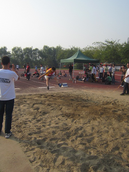 再看三级跳远的运动员,奔跑跳跃后,在天空中划出一条完美的弧线,绷紧全身力量奋力跃出,体现着力与美的完美结合。而我系俞剑同学在也在决赛中取得了第5名的好成绩。