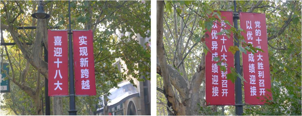 在2012.11.8-14日举行的十八大吸引了全国人民的目光,杭城大街小巷横幅飘飘,处处鲜花群簇,热情洋溢,以饱满的热情喜迎我们期待振奋的十八大。梧桐环绕下的杭州,时刻跟随党的脚步,实现新跨越,深谋新发展。