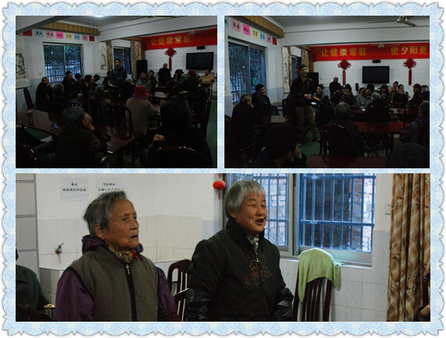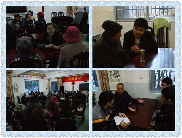 表演节目之余,老人们拉着同学们话起了家常,一时间屋子里充满了欢乐。我们了解到,公寓中总共有六十多位老人,年纪最大的已经有96岁,如今身体还十分健朗。老人们纷纷表示,这里环境清幽,平静安逸,大家都挺适应的。年轻时,老人们在自己的工作岗位上为国家的发展献出自己的一份力,如今也仍然关心着国家大事。对于党的十八大,他们亦是时刻关注,每一次重要会议的相关报道都不会错过。一位老人说:“党的十八大中所表现出的沉稳,客观让人觉得很踏实,感觉心里有着落啦”;另一位老人也马上表示,“看似十八大距离我们很远,实际上十八大涉及到我们的切身利益。只有社会稳定了,秩序才能好,物价才能稳定”。他们的话得到了在场的老人和同学们的一致赞同。最后因为时间原因,我们不得不告别老人们。希望我们以后还能再去,在公寓中物质条件方面基本不用愁,但是孤寂之情还是难免的。