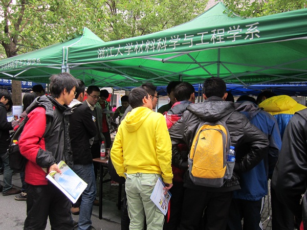 同时,现场发放的宣传资料也系统而全面地介绍了材料系一流的师资队伍和研究条件,以及丰富的研究方向和研究成果。更加使同学们对材料科学与工程专业的认识深化。值得一提的是,独特的实验室参观活动吸引了许多同学的关注和踊跃报名。