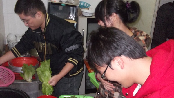 在精彩的团史知识竞赛结束之后,大家意犹未尽,开始自己动手丰衣足食,准备起我们共同的晚餐来。大家各有分工,支部内人才济济,有好几位颇有大厨风范,其他同学有的洗菜,有的包饺子,有的负责煮火锅,有的洗盘子,大家也过了一把“自己动手丰衣足食”的瘾。