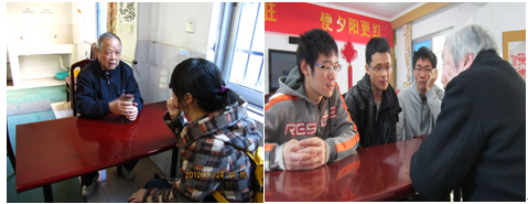 贾英强同学还和老人聊了旧社会的回忆,和现在幸福的晚年生活做了对比。活动后,贾同学说:“尽管现在社会的福利制度还不是很完善,但一直在不断的进步,相信会有一天我们的社会主义社会将迎来更加完善和谐的局面。”