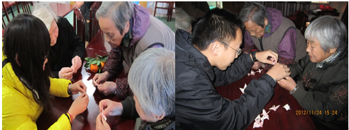 老人们对我们的纸鹤表达了强烈的好奇,于是,大家决定教老人们一起折纸鹤。同学们耐心地手把手和老人一起折纸鹤,有些难折的地方,会放慢速度并重复一遍遍示范。老人们心灵手巧,团员们耐心细致,不一会儿,老人们的作品也纷纷登场。祝福纸鹤满满地堆在桌上,略带寒意的大厅顿时洋溢着祖孙两代其乐融融的温馨和谐场面。
