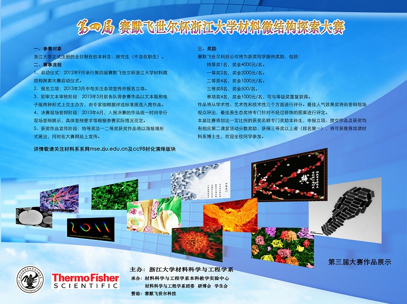 浙江大学材料科学与工程学系定于201212月至20136月举办第四届赛默飞世尔杯浙江大学材料微结构探索大赛,具体赛程如下: