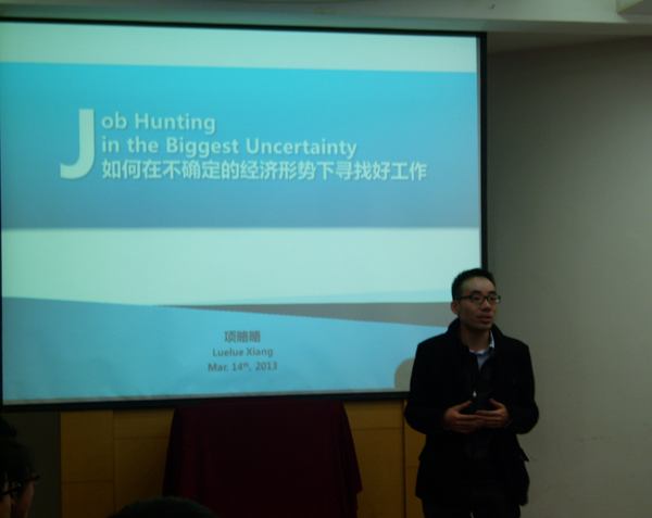 半导体所的项略略学长就如何在不确定的经济形势下寻找好工作的问题做了精彩的分析。他建议大家“自上而下”选择增长确定的行业,“自下而上”选择自己喜欢的,能够胜任的,可以学习的工作。用自己的确定面对不确定,于不确定中寻找最大的确定。对于无领导小组讨论,他提到角色不重要,逻辑,见解,团队精神最重要。