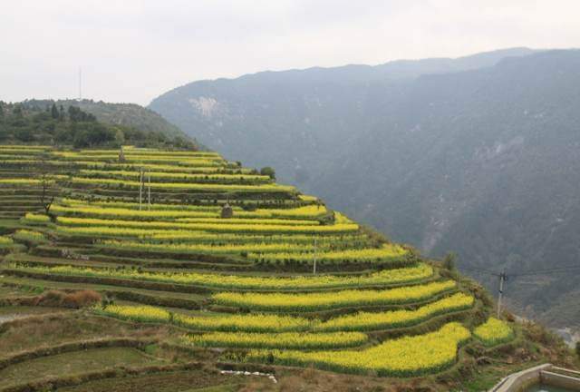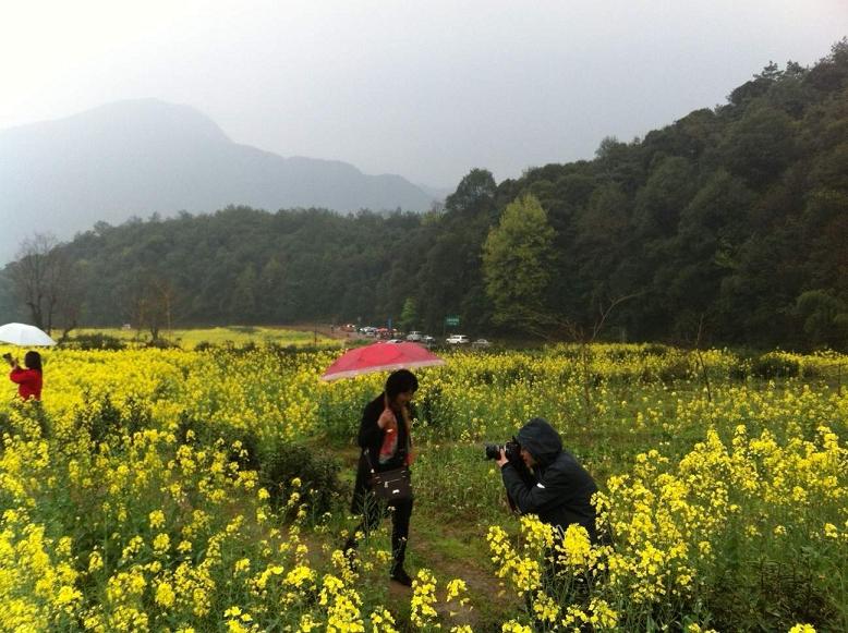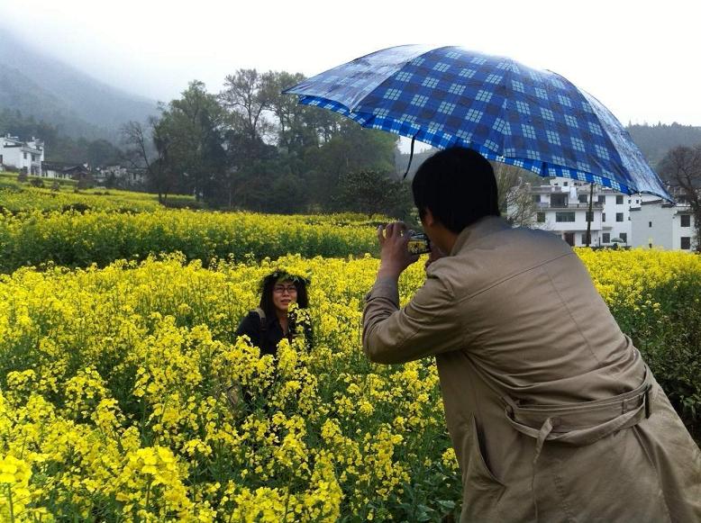 简单的中餐后,我们选择了具有“天上人间”之称的江岭欣赏梯田油菜风光。虽然天公不作美,下起了淅沥小雨,大家的心情丝毫没有受到影响,雨中赏花,别有一番意境。小车盘旋在山间小路,向下看去,漫山遍野油菜花黄,与白墙灰瓦的徽派建筑相互映衬,四周围绕着葱葱青山,一副美丽的婺源农村风光画卷展现在我们的面前。下车后,大家开心得向油菜花海奔去,纷纷拿起手中的相机,恨不得把所有美景都搬回家。