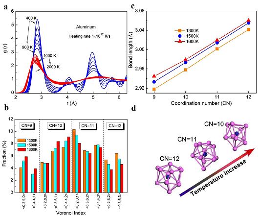 怎样理解这种新现象哪? 上图为纯Al的分子动力学模拟,图a为Al的双体相关函数g(r)随温度从400到2000 K的变化情况,显示熔点温度位于900到1000 K之间,非常接近实验测量值933.5 K。在1000到2000 K,g(r)的第一峰明显向低r方向移动。图b的Voronoi分形分析表明随温度的升高,高配位多面体(配位数为11和12)含量减少,而低配位(配位数为9和10)的多面体却在增多。图c显示高配位多面体中原子平均距离大于低配位多面体多面体中原子平均距离。因此,在液体金属中,近邻原子间距离的收缩可以这样理解:在高配位的多面体中,由于一些键长长,原子间相互作用弱。随着温度的升高,原子的振动加剧,这些原子最有可能从团簇中脱离出来,导致团簇配位数下降。本研究发现温度升高,配位数下降是液体金属中一个本质特征。图d示意说明温度升高,液体金属中高配位多面体逐渐向低配位多面体转变,随着低配位多面体的含量的增多,最近邻原子的距离就逐渐的缩短。