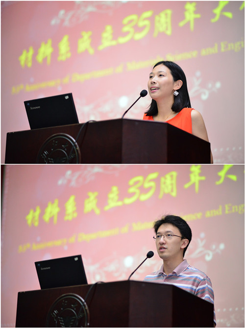 校博士生会原副主席高倩和2012年竺可桢奖获得者路宜作为学生代表发言,他们传达了学系全体在校生的心声。他们表示,每个材料学子的人生都与学系辉煌的历史和璀璨的未来紧密地联系在一起,他们必将不懈努力,使自己成为具有国际视野的未来材料领域领导者,为材料系美好的明天贡献自己的一份绵薄之力。