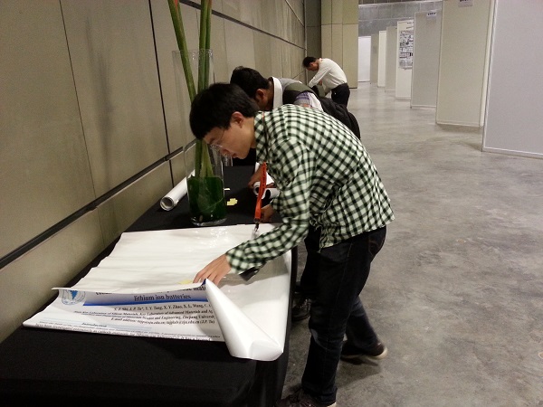 在会议第二天,队员施少君受邀在主会场同数百位来自不同国家的材料研究者一起,制备墙报,介绍其研究成果。施同学做的是目前已经商业化的正极三元材料,通过特定的改性手段,大大加强了这种材料的电化学性能,提高了循环稳定性。墙报展示宣传中,许多同行研究者提出了专业性的问题,施同学都给予了很好的解答。队员们也就自己感兴趣的研究,同其他研究者们相互交流,向他们提问,并提出自己的见解以及一些建议。在充满学术性氛围的会场中,队员们用英语同他人交流,很好的展示了自我,宣传了科技成果。