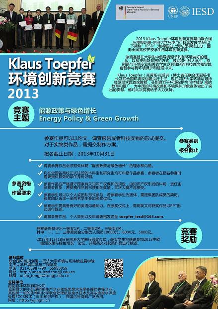 第三届 Klaus Toepfer环境创新竞赛是由联合国环境规划署-同济大学环境与可持续发展学院(以下简称“IESD”)和德国驻上海总领事馆主办,面向全国高校在校学生的环境创新竞赛。该竞赛旨在大学生中倡导资源节约和环境友好的理念,以科技创新竞赛的方式,鼓励和引导大学生。