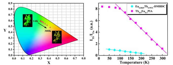针对荧光温度传感材料所存在的上述问题,材料系硅材料国家重点实验室博士研究生饶兴堂(导师:钱国栋教授)通过选择和设计合适的有机配体和稀土离子,引入双发光中心,合成了一种双稀土离子的金属-有机框架材料(MOFs),成功实现了具有自校准特性的高灵敏荧光温度传感。该研究工作从原理上探讨了稀土离子(Tb3+和Eu3+)与有机配体之间的能量传递机制,并推断该过程与荧光温度探测灵敏度具有关联性。从而创新地设计和选择了具有较高三重态能级的有机配体,制备了一种二维结构的双金属-有机框架物材料(Tb0.9Eu0.1PIA),该材料在很宽的低温区域(100300K)内,双发光中心Tb3+/Eu3+的荧光强度比值与温度成线性关系,呈现出很好的自校准荧光温度传感特性,并表现出很高的温度敏感度(单位温度达3.53%),同时还可实现具有较高空间分辨率的温度成像。这一研究成果为今后研发具有更高温度敏感性的自校准荧光温度传感材料提供了新颖的设计思路。
